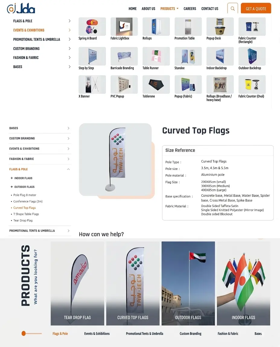 JDA Advertising is a well‑established fabric digital printing company in the UAE, known for its large‑format printing, fluorescent color solutions, and custom event branding services. With a rapidly expanding product range and a growing customer base, JDA needed a website capable of presenting hundreds of product variations in a clean, organized, and user‑friendly way. Their previous digital presence lacked the structure and performance required to support such a large catalog, making it difficult for customers to explore their full range of printing solutions.